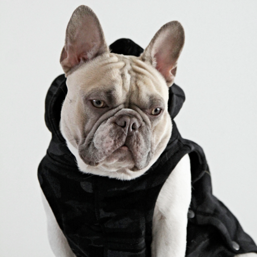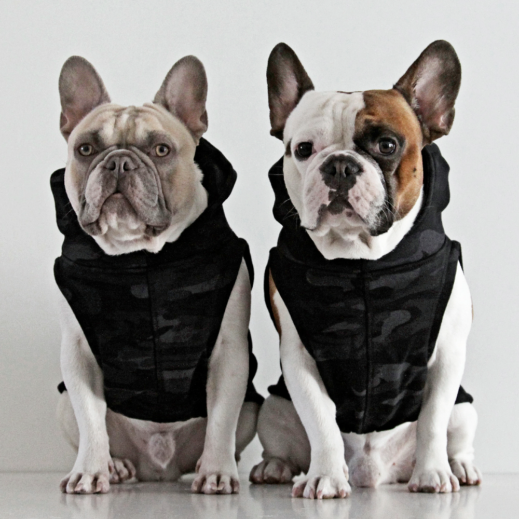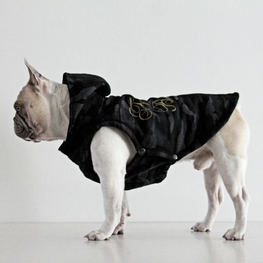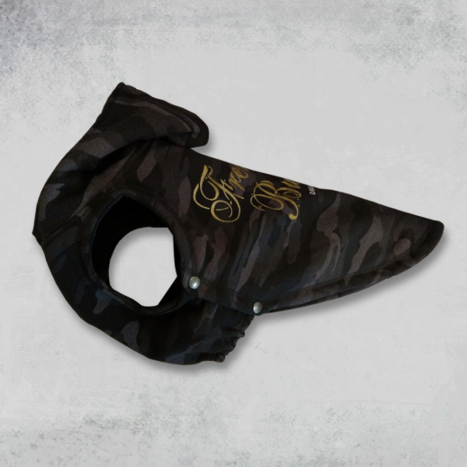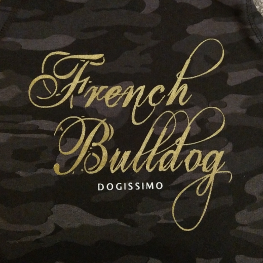 Our latest camo hoodie made from the finest sweatshirt fleece with grey lined hood with Glitter gold “French Bulldog” printing on rear.